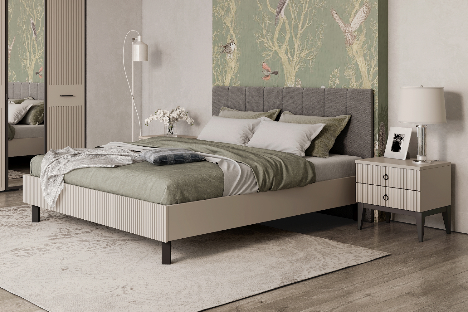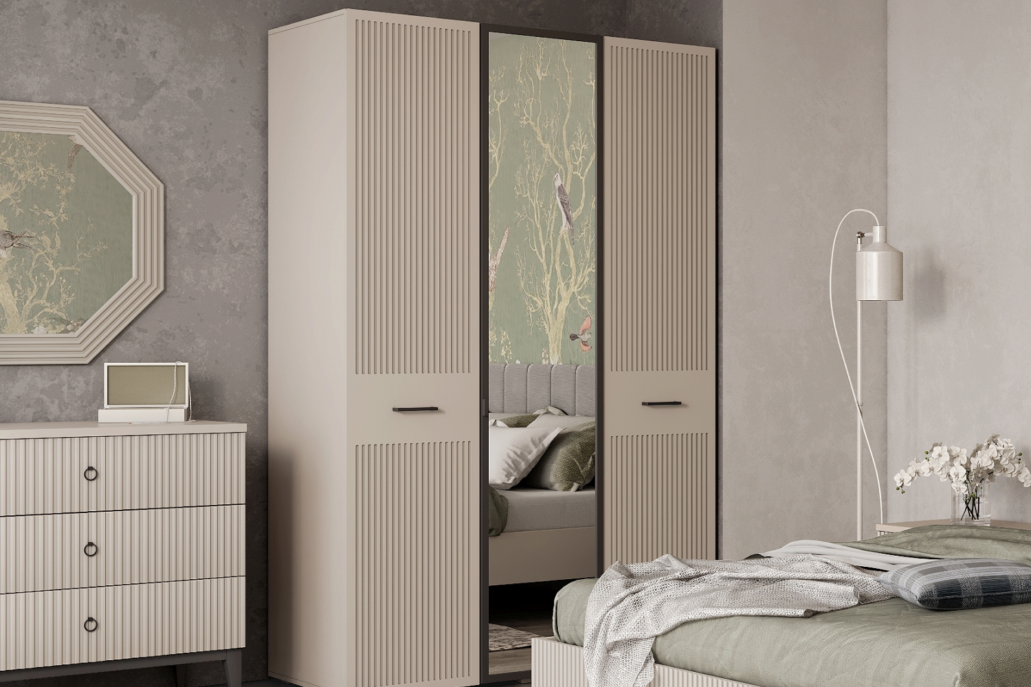 - Для хранения в спальне есть большой шкаф с зеркалом элегантного пепельного оттенка «графит», что придаёт дополнительный шарм коллекции;