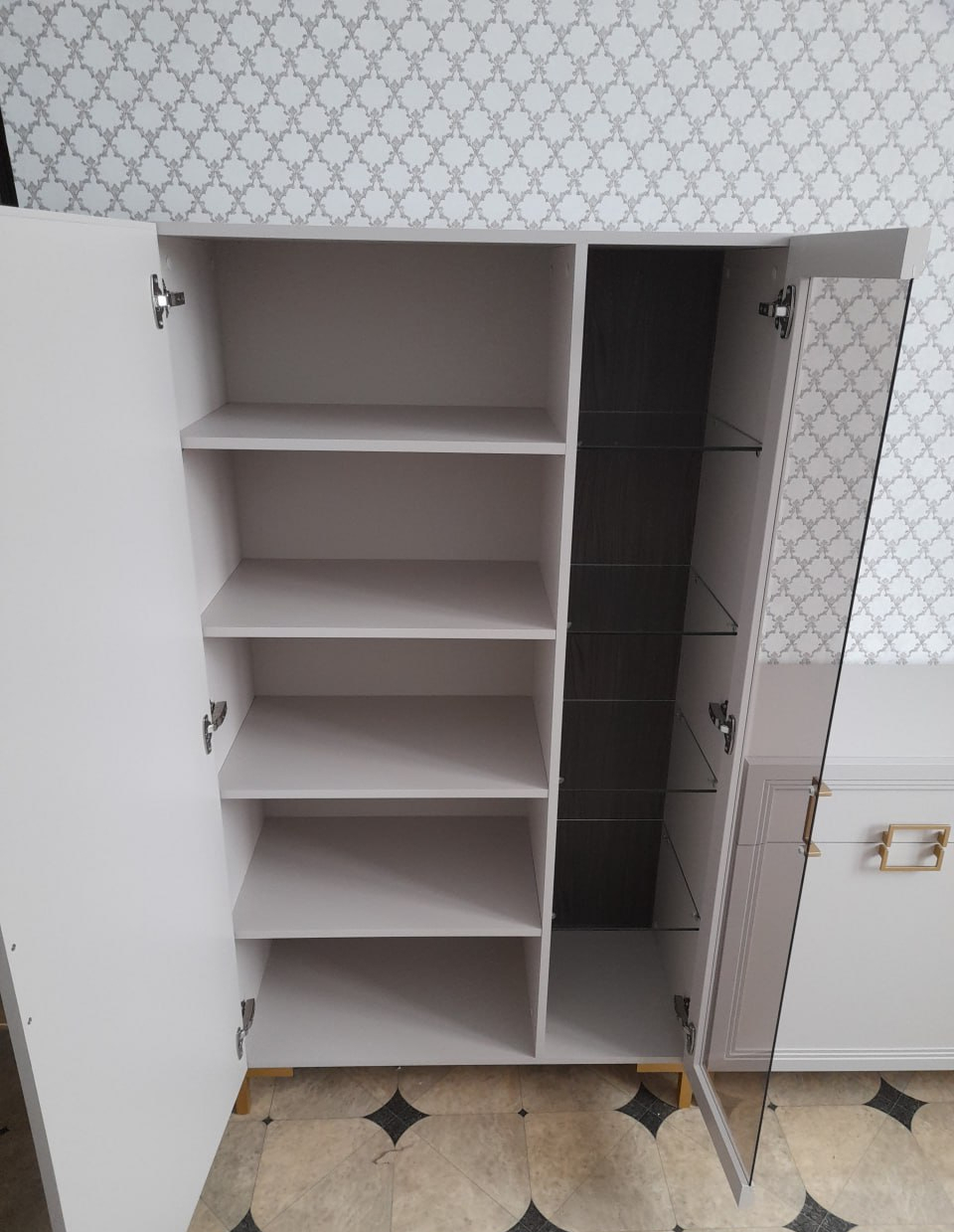 - Внутреннее наполнение: 4 стеклополки 6 мм за стеклянным фасадом, и 1 полка ЛДСП 16 мм — за глухим;